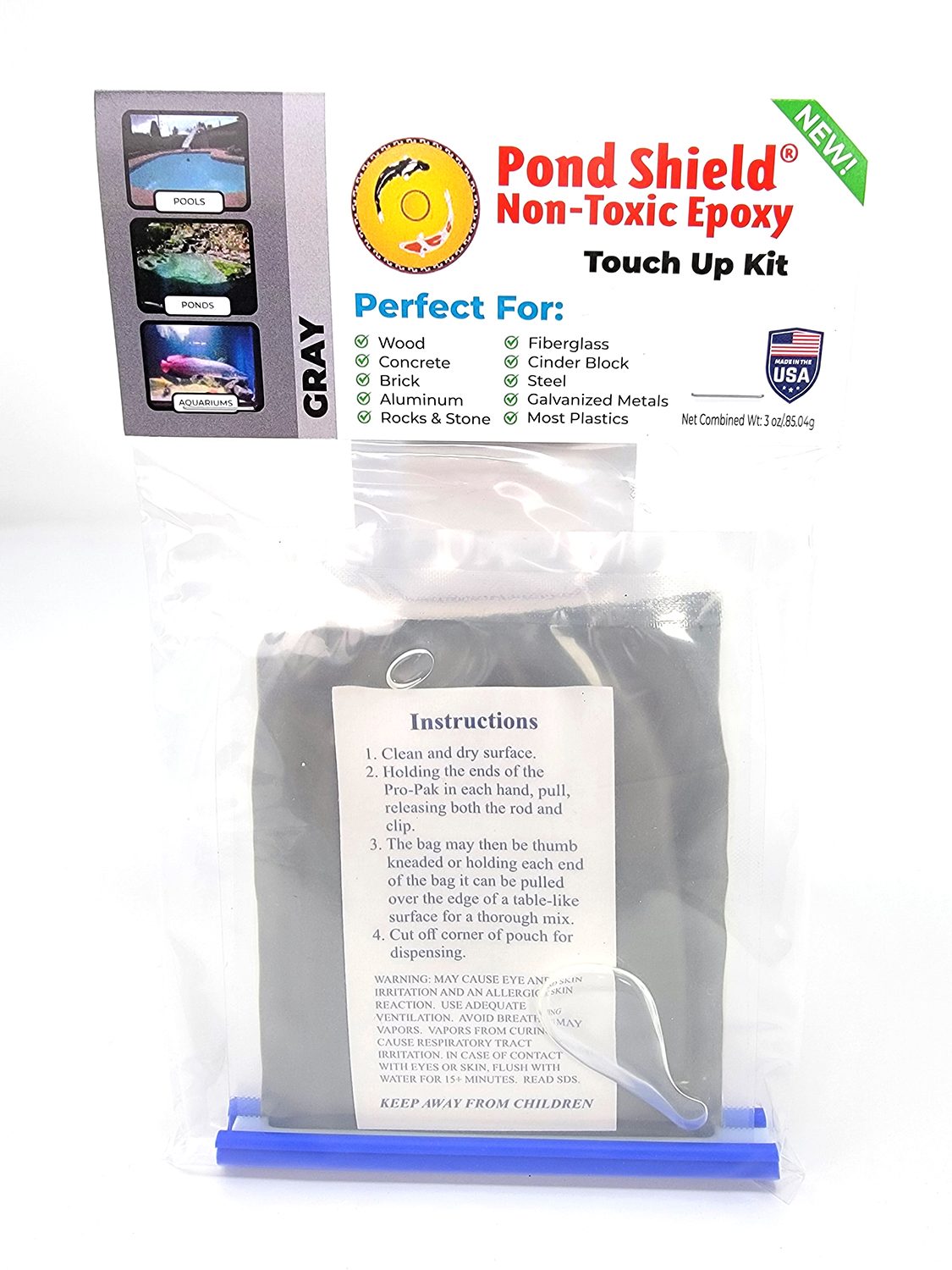 Pond Shield non-toxic epoxy coating touch up kit – GRAY. Safe for fish and plants. Easy application. Very low maintenance after installation. Made from space age polymers that are designed to provide long life and excellent wear resistance. Has an excellent bond strength to almost any surface, very impact resistant and is designed to flex when needed making this coating the best option for waterproofing your pond, fountain, or other type of water feature. Is very chemical resistant and can be used in chlorinated environments as well. The perfect waterproof coating for other than water feature projects as well.