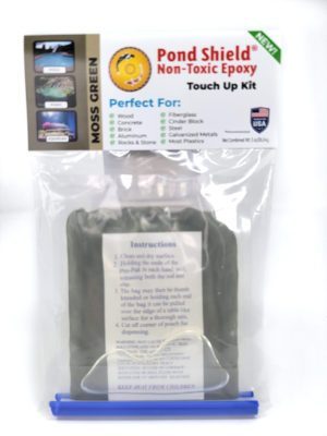 Pond Shield non-toxic epoxy coating touch up kit – MOSS GREEN. Safe for fish and plants. Easy application. Very low maintenance after installation. Made from space age polymers that are designed to provide long life and excellent wear resistance. Has an excellent bond strength to almost any surface, very impact resistant and is designed to flex when needed making this coating the best option for waterproofing your pond, fountain, or other type of water feature. Is very chemical resistant and can be used in chlorinated environments as well. The perfect waterproof coating for other than water feature projects as well.